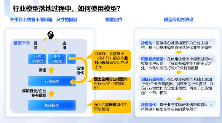 “模型矩阵”有别于传统单一大模型应用框架及思路,通过组合和协同多个不同规格、不同专长的大模型,通过分工、协作与精细化运营,实现了在复杂业务场景中成本、效率与效果的平衡。他提出了一个层次分明、协同高效的技术框架——构建涵盖基座模型、行业模型与小业务模型的三级模型平台应用体系。该体系通过全方位、多维度的能力支撑,显著优化了空间治理场景中的模型应用效果,为实际业务落地实践提供了解决方案。