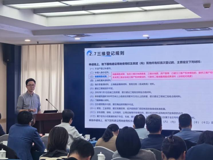 北京市测绘设计研究院正高级工程师郑源以《北京市三维地籍管理研究与应用》为题做报告,深入介绍了三维不动产单元的确权方法,通过融合二维、高程与三维模型,实现了从平面到立体空间管理的升级,并创新性地利用立体钉桩技术,为复杂产权界定提供了法定依据。