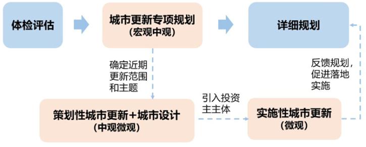 以国土空间规划为基础,结合城市体检评估结果,建立三级城市更新规划实施体系:专项规划、片区策划、项目实施方案,实现从宏观战略到微观实施的有效传导。规划实施依托“城市设计+控规”双轮驱动,将城市更新专项规划的核心意图(如风貌管控、功能复合)转化为城市设计导则,嵌入控规编制,同时控规动态响应用地政策变化(如容积率奖励、地下空间确权),为未来预留弹性接口。