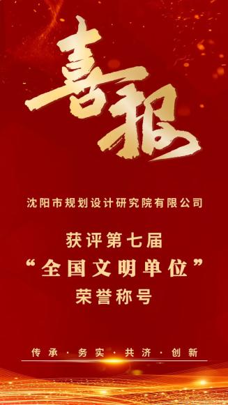 近日,据中央精神文明建设办公室,沈阳市规划设计研究院有限公司成功获评第七届全国文明单位荣誉称号,荣膺国家级文明典范。这一荣誉的取得是多年来坚持党建引领、积极践行企业文化、勇担社会责任、大力加强团队建设的结果,是全体员工共同努力的结晶。