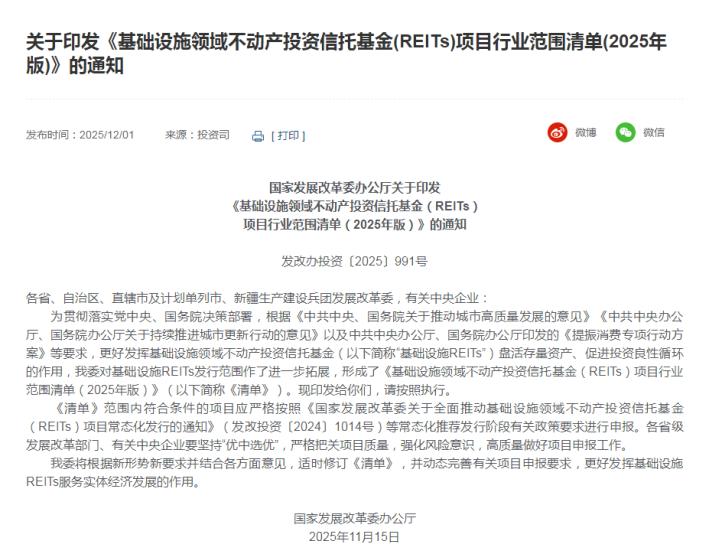 为贯彻落实党中央、国务院决策部署,根据《中共中央、国务院关于推动城市高质量发展的意见》《中共中央办公厅、国务院办公厅关于持续推进城市更新行动的意见》以及中共中央办公厅、国务院办公厅印发的《提振消费专项行动方案》等要求,更好发挥基础设施领域不动产投资信托基金(以下简称“基础设施REITs”)盘活存量资产、促进投资良性循环的作用,我委对基础设施REITs发行范围作了进一步拓展,形成了《基础设施领域不动产投资信托基金(REITs)项目行业范围清单(2025年版)》(以下简称《清单》)。现印发给你们,请按照执行。
