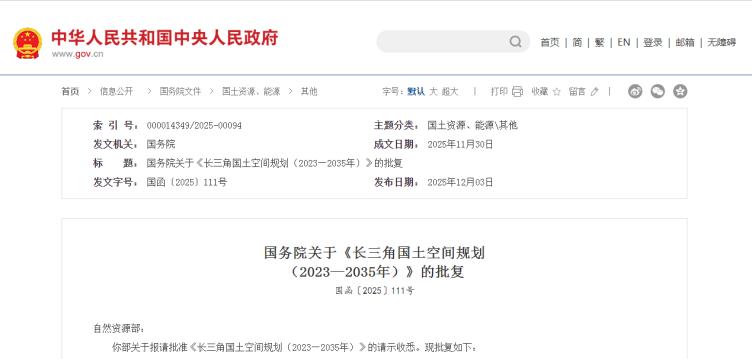 国务院批复同意《长三角国土空间规划(2023—2035年)》