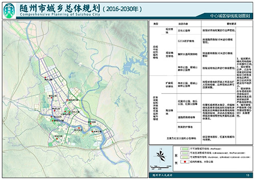 (3)针对实际管理问题和需求,创新性提出城市“五线”划定与实施管控的系统思路。城市“五线”划定(蓝线、绿线、紫线、黄线、红线)是城市总体规划的重要内容,但长期以来城市“五线”划定缺乏明确的划定标准和深度要求,导致城市“五线”划定的规范性和科学性不足,难以适用城市规划实施管理和督察工作的需要。北京清华同衡规划设计研究院在随州市城乡总体规划编制过程中对城市“五线”划定和实施管控主要做了如下工作:一是分类对待,科学界定“五线”在总体规划中的划定要求和深度。明确区分现状、在建和规划确定具体选址的城市“五线”,以及尚未确定具体用地范围的城市“五线”.根据不同类别情况划定不同的规划深度,同时结合划定对象的等级,提出相应的管控要求。对已经确定具体选址或选线的城市“五线”按照实际用地范围控制线进行划定管控;对于尚未确定具体选址和选线的重大基础设施和各类控制界线等进行规模、位置或规划管控引导,下位规划、专项规划细化后进行反馈备案。二是明确提出五线划定后,城市总体规划与下位规划、专项规划和建设规划的衔接方式,明确要求建立备案反馈机制。三是创新性五线图则表达方式,并通过信息平台对总体规划进行反馈,规划将道路红线、城市绿线、城市蓝线、城市黄线、城市紫线作为重要内容纳入规划管理系统,对城市“五线”进行动态维护,推进规划编制审批监管统一,不断完善“五线”划定工作,保证城市总体规划的时效性和适应性。